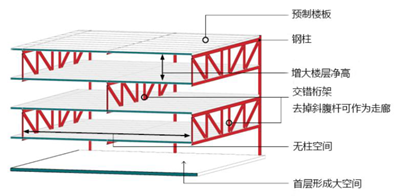 是指以預制鋼筋混凝土柱或鋼柱、鋼桁架、預制樓板等預制構件組成的大跨度空間結構,主體結構采用裝配式交錯桁架結構,配置外墻、內隔墻和樓蓋系統的建筑。